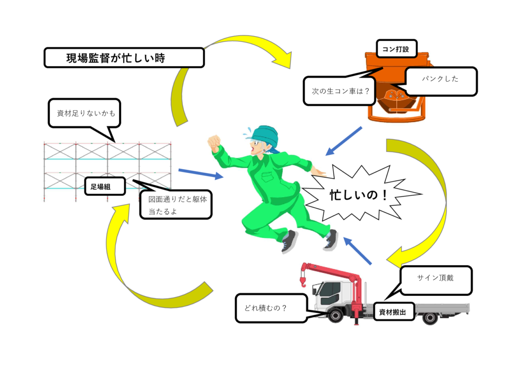 現場管理の実態は事務所作業以外の時は現場を常に行き来しています。コンクリ打設の作業に行って、次は搬出合番に、また打設に戻ろうと思ったら、足場組確認の電話が入って…