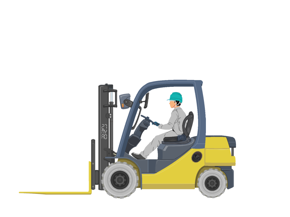 シンプルで使いやすいタッチで描かれており、建設現場や物流倉庫の安全教育資料、作業マニュアル、社内掲示物などにご利用いただけます。フォークリフト イラスト、作業員 イラスト、建設現場 イラストをお探しの方におすすめです。