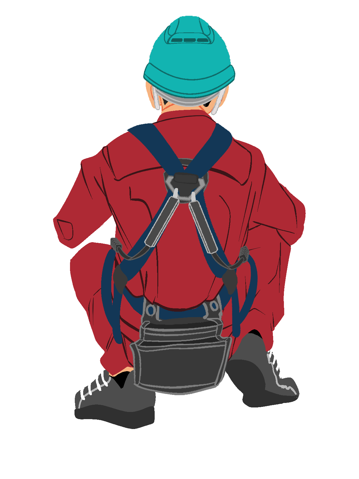 番線結束、資材楊重など足元作業の際に、一時的にしゃがみこんでいる状態を表現。後方からの視認を意識した背面構図で、他作業員の存在に気づかせる注意喚起シーンにも応用可能です。