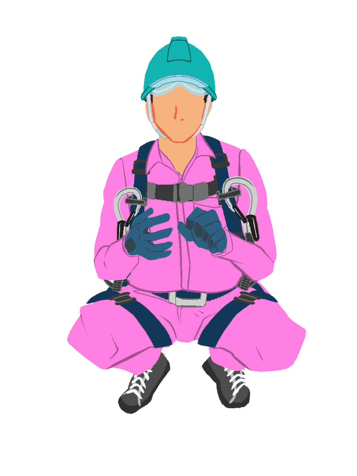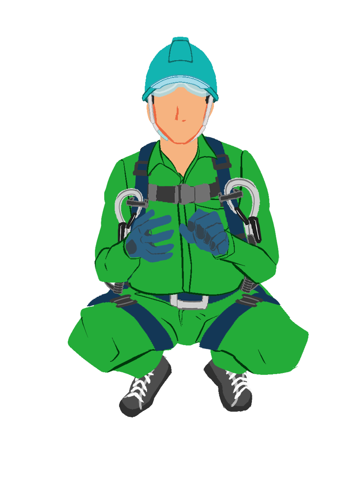 イラスト335〜344.しゃがむ作業員1正面ハーネス・ヘルメット付のイラストです。